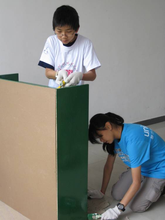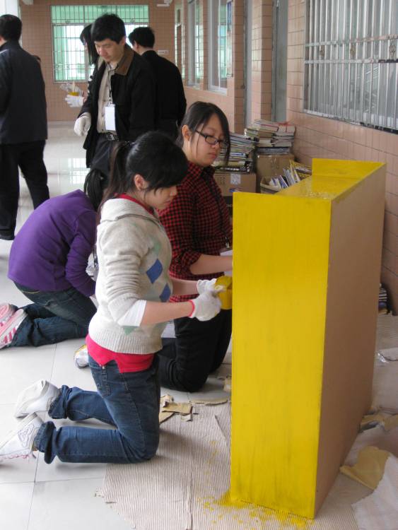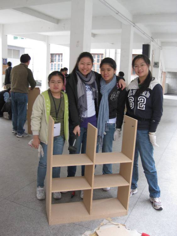With the joint efforts of all participants, a total of 20 book-shelves were built, painted and set up in the library of San Jiang Primary School. Books received from Jiangnan Middle School, whose teachers and students visited SPCS in January, were also donated to this library and put up on the book-shelves at the same time. Our student participants were in return arranged to learn needle-work and skills from the students there.